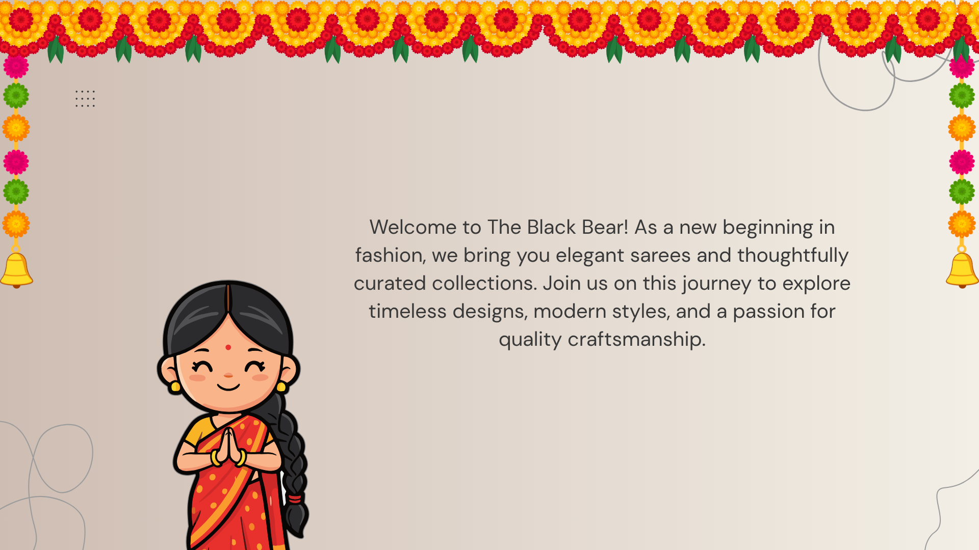 Something beautiful is on its way! The Black Bear is preparing to launch stunning saree collections crafted with elegance and modern charm. Stay tuned for our grand reveal — where tradition meets style in every weave and drape.